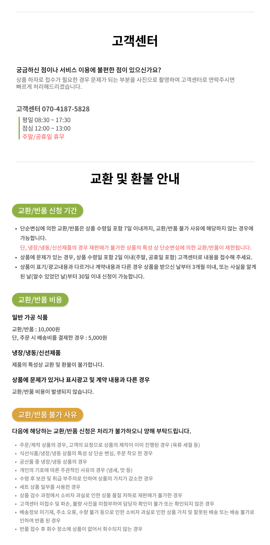 교환/반품 비용 | 일반 가공식품 반품/교환 : 10,000원 단, 주문 시 배송비를 결제한 경우 : 5,000원 냉장/냉동/신선식품 상품에 문제가 있거나 표시광고 및 계약 내용과 다른 경우 |